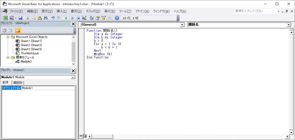 今回のプログラムではaの【初期値】を1に設定し、【終了の数】を10に設定しました。
